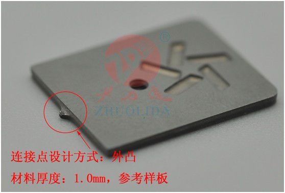 1、外凸式 外凸式連接點設計主要是應用于標牌,手機外殼,產品的外殼等表面鍵,外觀看上去不可有毛邊、凹點等缺陷。外凸式計也有兩種方式,一種是材料厚度大于0.3時,連接點可以設計為正面半刻,背面才有連接點,方便打磨等方式去掉;另一種是厚度小于0.3時,連接點不可半刻,以下圖紙是一種設計方案!