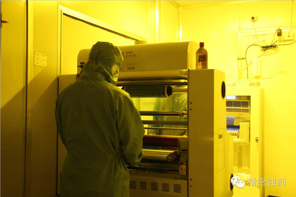 顯影之后,將酸性蝕刻劑噴至材料表面,或將材料浸于其中。蝕刻劑會將硬化保護層以外的材料溶解,剩下來的部分就是所需的部件形狀。