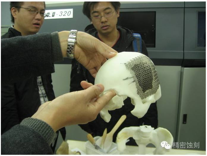 精密蝕刻技術在醫學材料及醫療設備加工上具有很大應用潛力,能夠簡化諸如頭蓋骨重造網等復雜部件的加工過程。由于顱骨板是一種擰于頭骨上方的網狀物。組織通過網孔生長,將板塊固定于頭部。顱骨板的表面須非常光滑,因為金屬表面如果有任何突起,都將刺透并傷害周圍生長的組織。